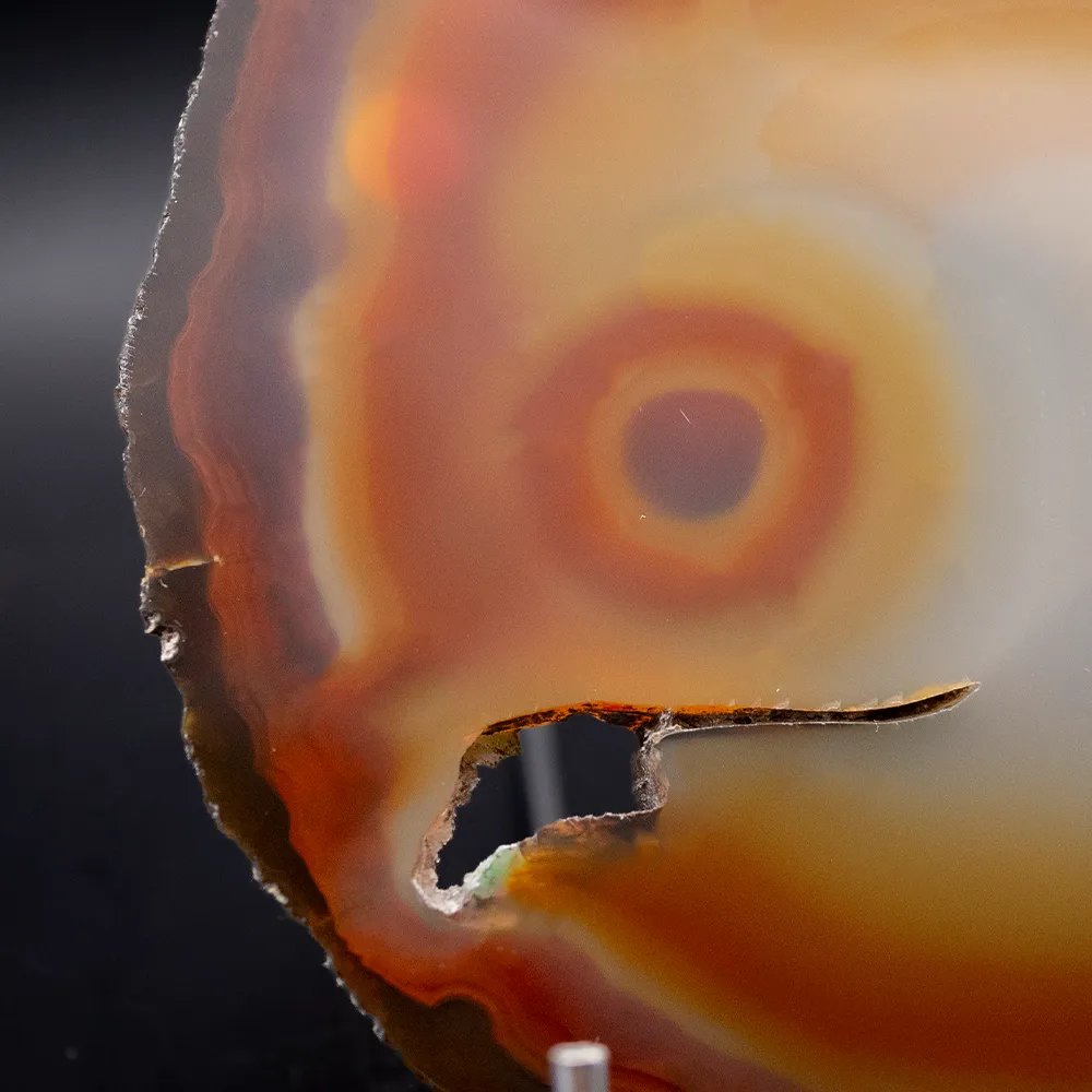 Diese beeindruckende Achat-Scheibe zeichnet sich durch ihre einzigartige und fesselnde Konzentrik aus, die in einem lebendigen Muster aus Weiß, Orange und Braun präsentiert wird. Die Scheibe zeigt einen natürlichen, nahezu perfekten Kreis im Zentrum, der von konzentrischen Ringen umgeben ist, die sich nach außen hin mit intensiveren Farben abwechseln. Die polierte Oberfläche des Achats hebt die lebhaften Farben und die natürliche Maserung des Steins hervor, wodurch ein optisch ansprechendes Spiel aus Farben und Texturen entsteht. Die Klarheit und Tiefe der Farben werden durch das durchscheinende Material betont, was der Scheibe eine leuchtende Qualität verleiht, die je nach Lichteinfall variiert.