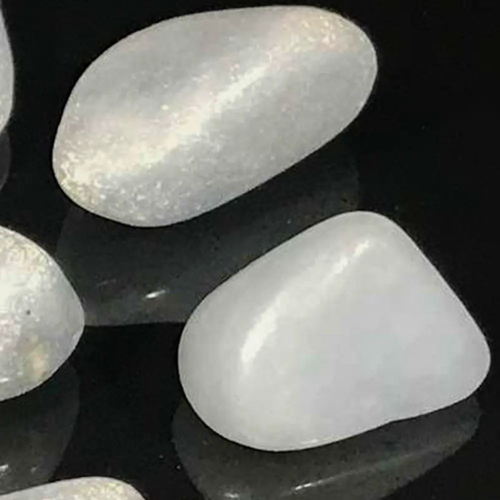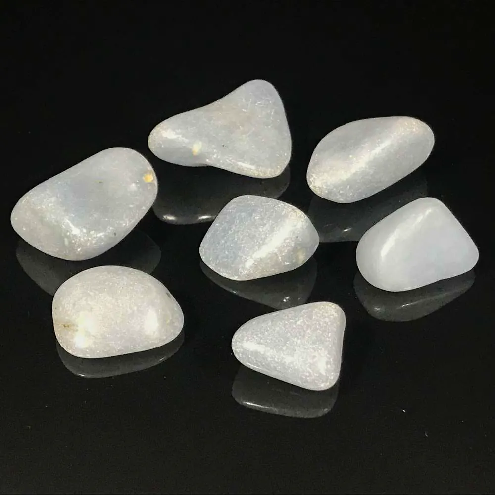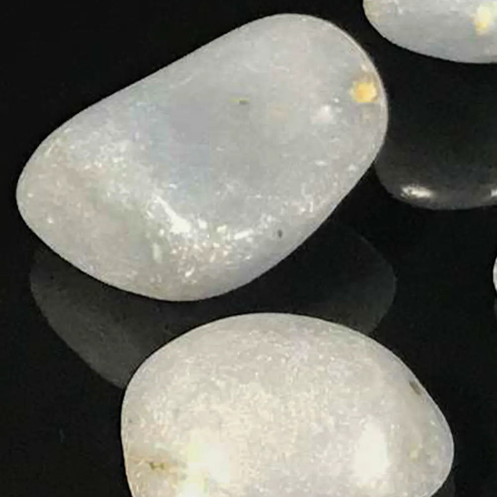 Ein wunderschöner Angelit mit einer sehr schönen hell-grauen, bläulichen Farbe. Auch durch die leicht raue Oberfläche wirkt der Stein sehr natürlich. Dieser Trommelsteine sind von Hand ausgesucht und wurden im Gleitschliff Verfahren geschliffen und poliert. Das Foto ist ein Beispielbild.