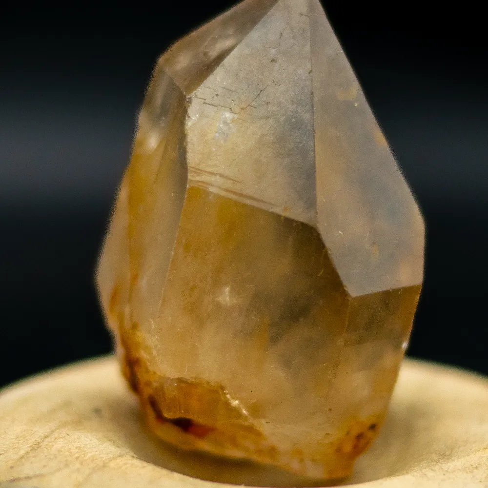 Dieser Bergkristall präsentiert sich in einer warmen, bernsteinähnlichen Farbe, die durch Einschlüsse und natürliche Verfärbungen entsteht. Die Kristallform ist gut definiert, mit scharfen Spitzen und klaren Facetten, die das Licht eindrucksvoll brechen. Bergkristalle wie dieser sind beliebt für Sammlungen und als Bestandteil von Schmuckstücken, da sie wegen ihrer Klarheit und natürlichen Schönheit geschätzt werden. Sie werden oft in der Heilkunde und in meditativen Praktiken verwendet, wo man ihnen eine beruhigende Wirkung zuschreibt.