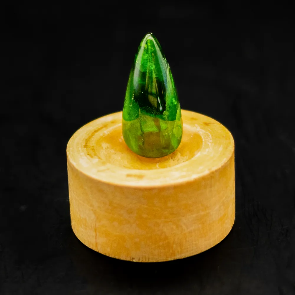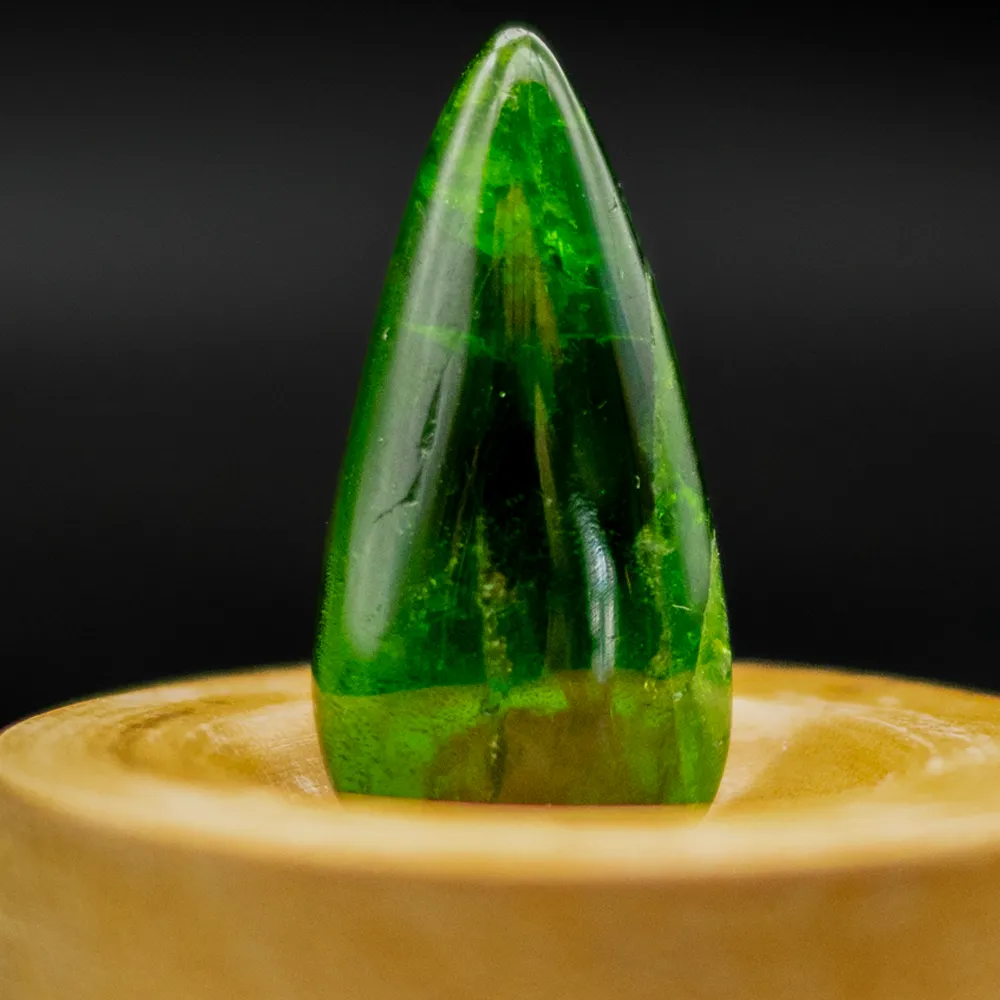 Dieser Chromdiopsid zeigt eine außergewöhnliche Tropfenform, die auf einem simplen, hellen Holzsockel präsentiert wird. Seine intensiv grüne Farbe ist reich und lebendig, wobei die inneren Einschlüsse und die klare Struktur des Steins ein faszinierendes Lichtspiel erzeugen. Der polierte Stein fängt das Licht auf eine Weise ein, die seine natürliche Schönheit und den tiefen Glanz hervorhebt. Ein solcher Edelstein vereint ästhetischen Genuss mit der Faszination natürlicher Mineralien und ist ein Highlight für jede Sammlung.