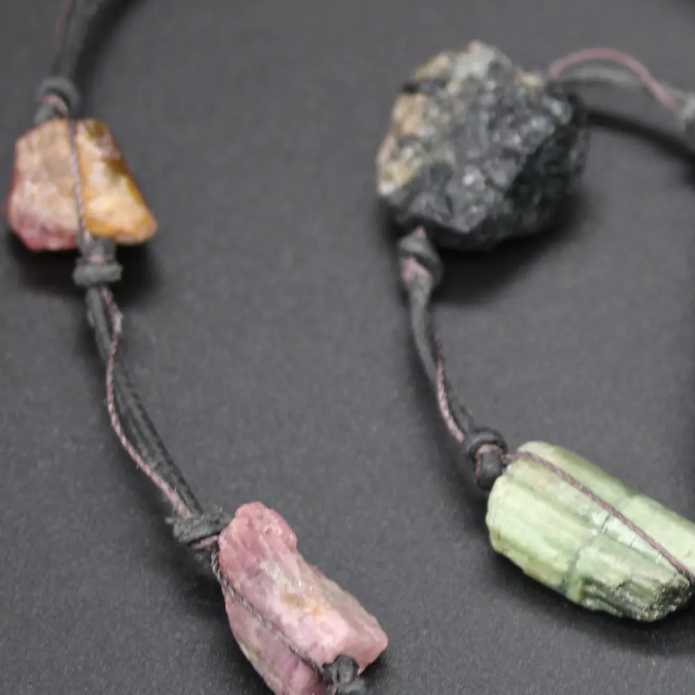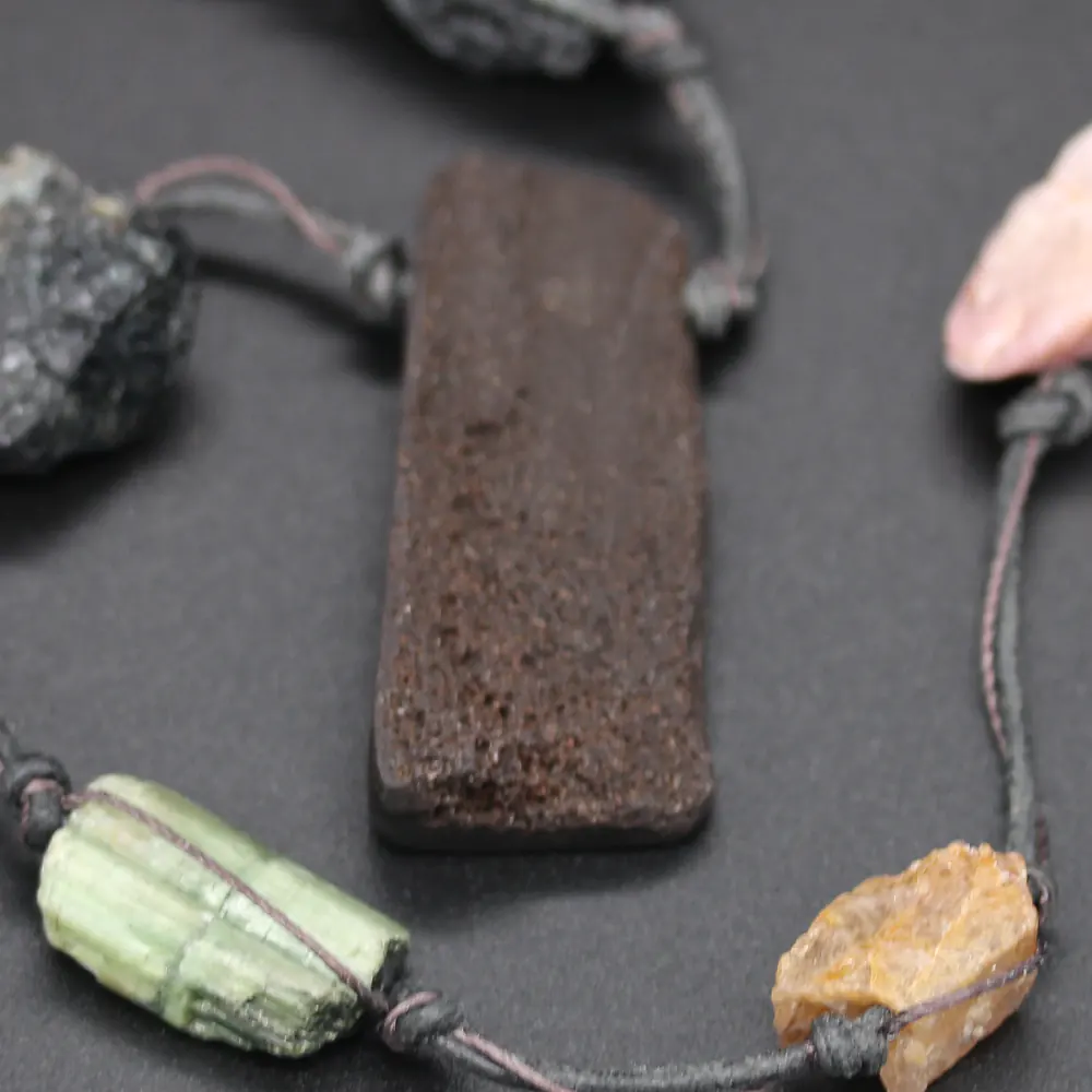 Eine wunderschöne Edelstein Kette aus fossilem Holz, Quarzkristallen und Turmalin. Diese natürlich gehaltene Kette ist mit glitzerndem Quarz überwachsenem fossilem Holz, sowie grün, rosanen und schwarzen Turmalin Steinen geschmückt. Außerdem kann die Kette über ein schwarzes Lederband in der Länge angepasst werden. Die Kette wurde in Handarbeit hergestellt.