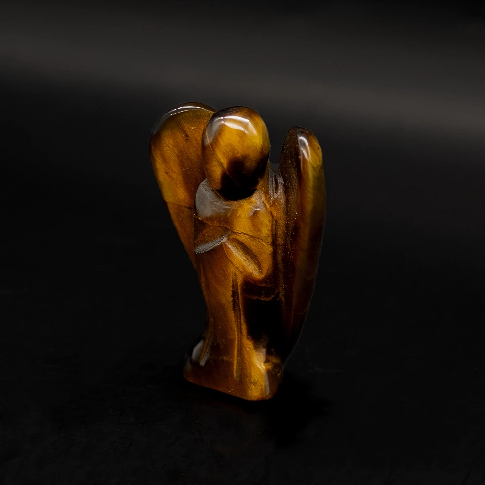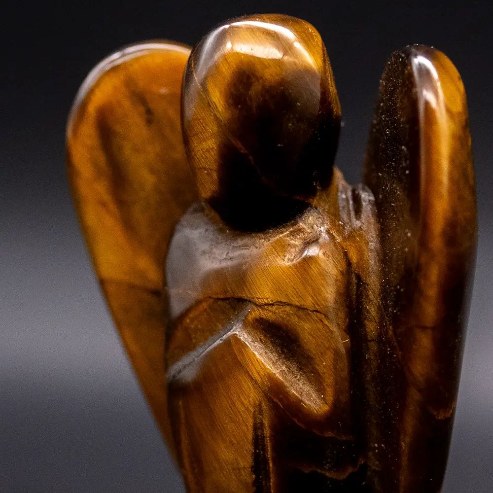 Die Figur des Engels strahlt mit ihren geschwungenen Flügeln und der liebevoll dargestellten Haltung eine beruhigende Präsenz aus. Die reiche Farbpalette des Tigereisens, von tiefem Braun bis zu goldenen und roten Tönen, verleiht dem Engel eine warme und erdige Ausstrahlung, die in jedem Raum, in dem er aufgestellt wird, sowohl Ruhe als auch Kraft spendet.
