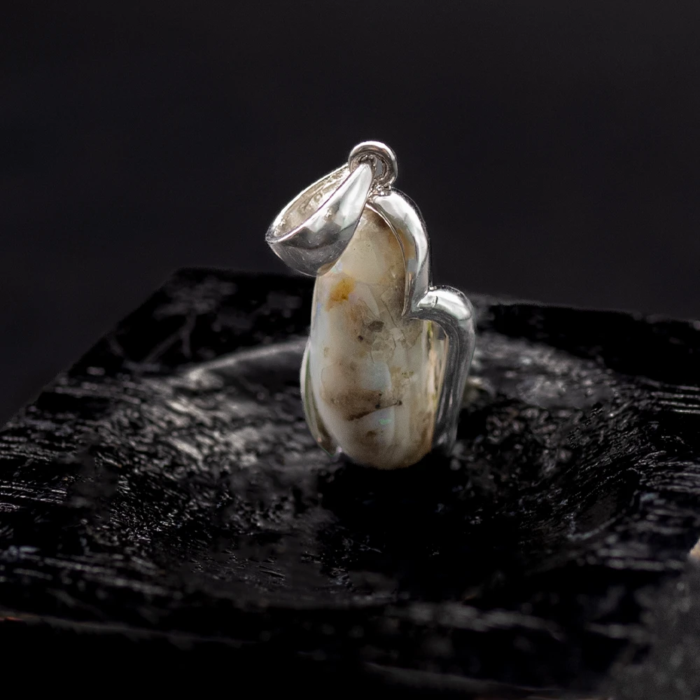Dieser ansprechende Anhänger zeigt einen Hydrogrossular in einer faszinierenden und einzigartigen Form, umhüllt von einer zarten und kunstvoll gestalteten Silberfassung. Der Stein präsentiert sich in natürlichen Creme- und Erdtönen mit durchzogenen Adern und Flecken, die ein erdiges und warmes Farbspiel erzeugen.