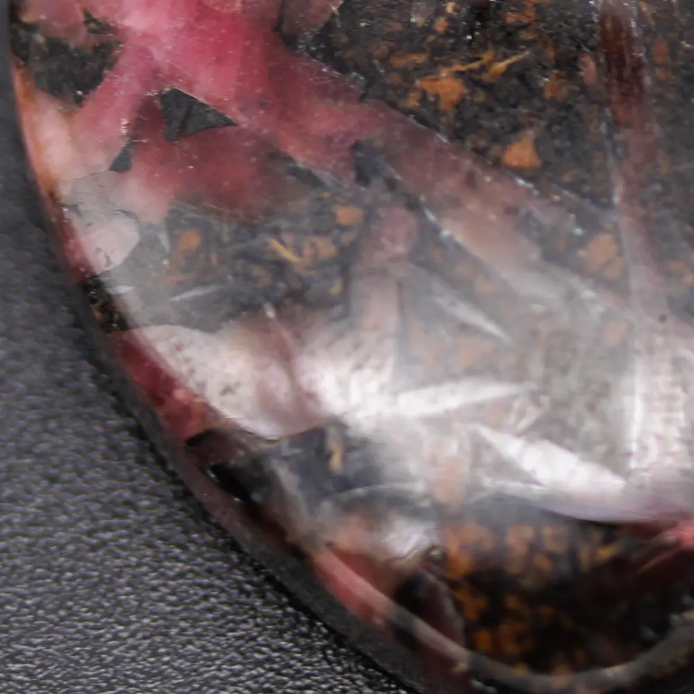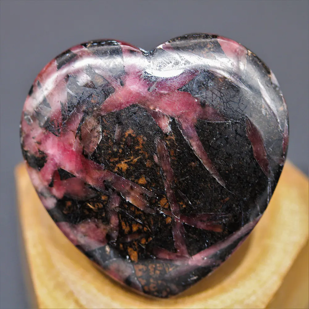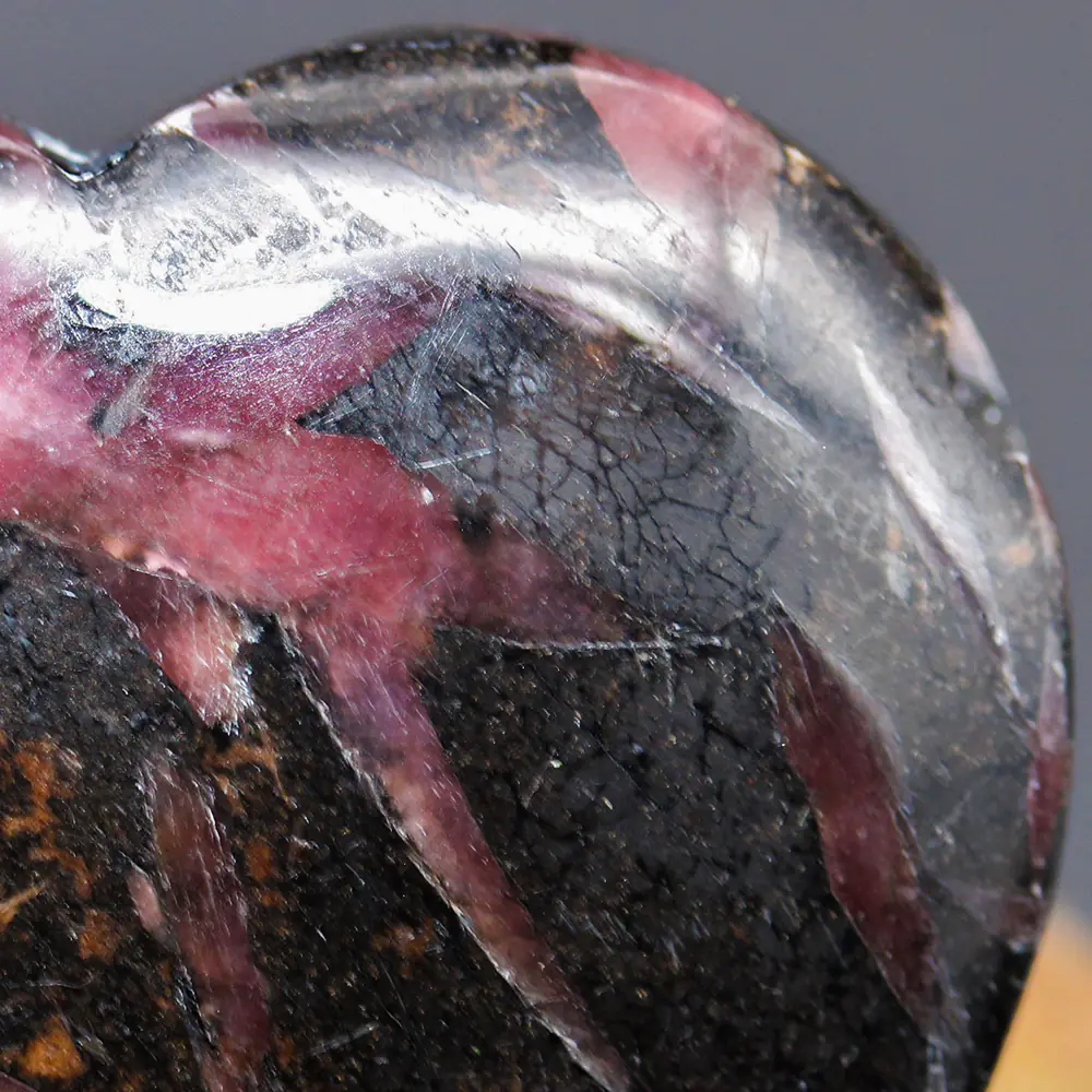 Ein wunderschöner Rhodonit Anhänger, geschliffen und poliert in Herzform. Dieser Edelstein hat eine satte schwarze Farbe. Er ist durchsetzt von vielen prägnanten Gesteinsadern in rosa- violett. Unter dem abstrakten, netzartigen schwarzen Muster durchziehen unzählige bronzefarbene Partikel dieses besondere Schmuckstück.