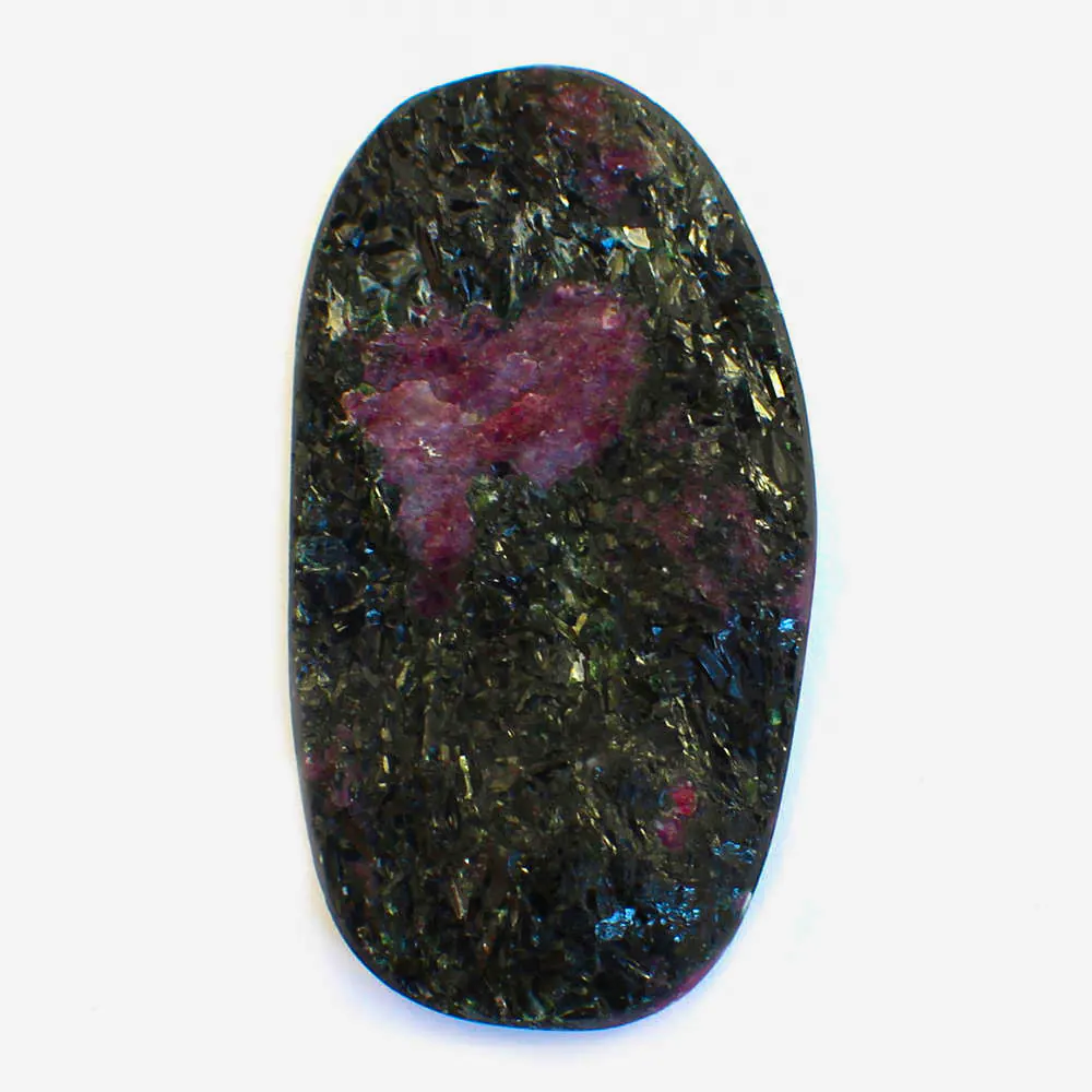Ein wunderschöner Rubin Zoisit Anhänger mit natürlich belassener Oberfläche. Dieser edle Rubin Zoisit ist geschmückt von blau schmimmernde Fragmenten und ist von einem schwarz, grauen Gestein umgeben.