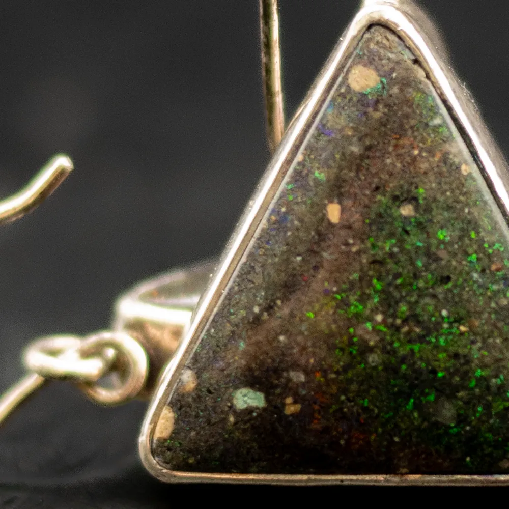 Diese Ohrringe mit schwarzem Opal in Dreiecksform sind ein Meisterwerk der Schmuckkunst. Der tiefschwarze Grundton des Opals, durchzogen von schimmernden Farbexplosionen, fängt das Licht bei jeder Bewegung ein und reflektiert ein Spektrum an Farben, von tiefem Grün bis zu funkelndem Rot.