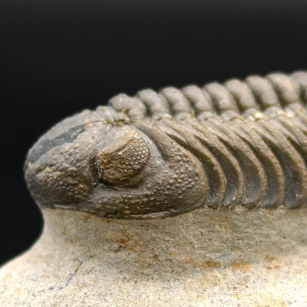Dieser Trilobit zeigt erneut die faszinierende Anatomie dieser uralten Meeresbewohner. Der hier abgebildete Trilobit ist auf einem Teil der umgebenden Gesteinsmatrix erhalten geblieben, was den Fund noch authentischer und natürlicher erscheinen lässt. Die detailreiche Segmentierung des Körpers und die gut erhaltenen Augen zeugen von der ausgezeichneten Fossilisierung.
