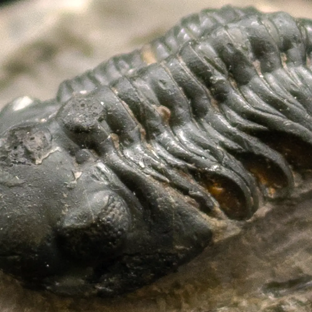 Dieser Trilobit zeigt einen gut erhaltenen fossilen Abdruck mit einer klaren Segmentierung seines Körpers. Die typischen Merkmale eines Trilobiten, wie der gegliederte Rückenpanzer und die gut sichtbaren Augen, sind deutlich zu erkennen. Diese Art von Fossil stammt aus der Zeit des Paläozoikums und bietet einen faszinierenden Einblick in die frühe Entwicklung des Lebens auf der Erde. Besonders die Details der feinen Rippenstruktur auf dem Körper dieses Exemplars machen es zu einem herausragenden Stück für Sammler oder Paläontologie-Interessierte.