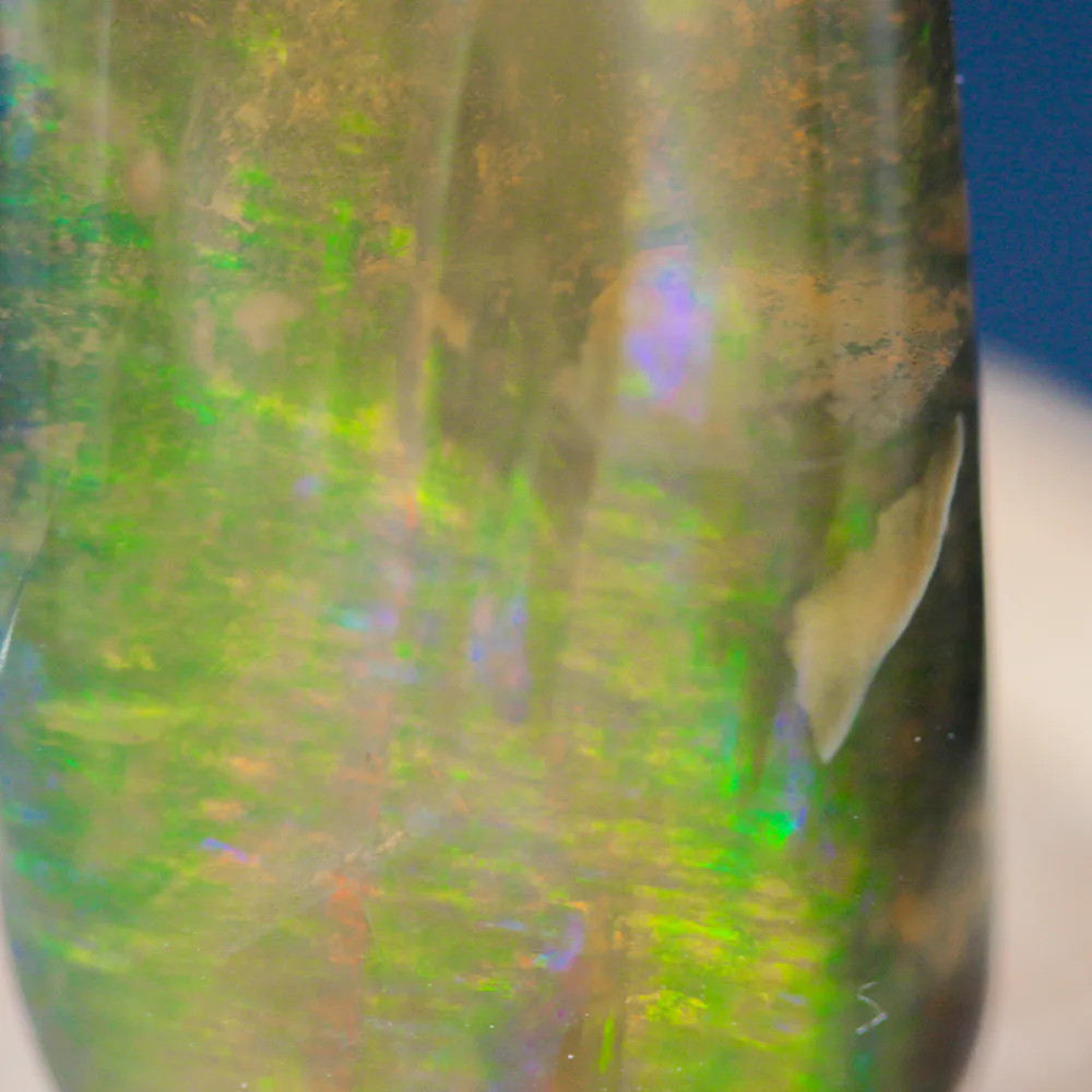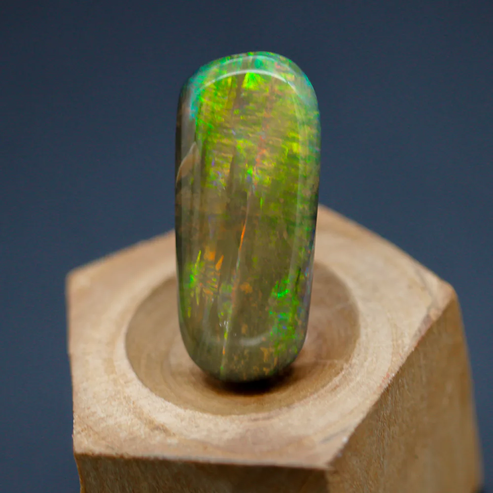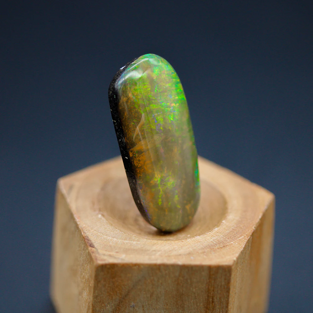 Ein wunderschöner und seltener Veta Opal zu einem Cabochon geschliffen. Dieser besonders seltene Veta Opal schimmert in allen Farben des Regenbogens. Besonders besticht das außergewöhnlich leuchtendende grün. Sowie ein auffallender blauer Schimmer in der Mitte. Dieser Veta Opal enthält auch beeindruckenden orangenen Einschlüsse welche dem Edelstein einen besonderen Charakter geben. Die Rückseite des Cabochons besteht aus schwarzem Matrixgestein.